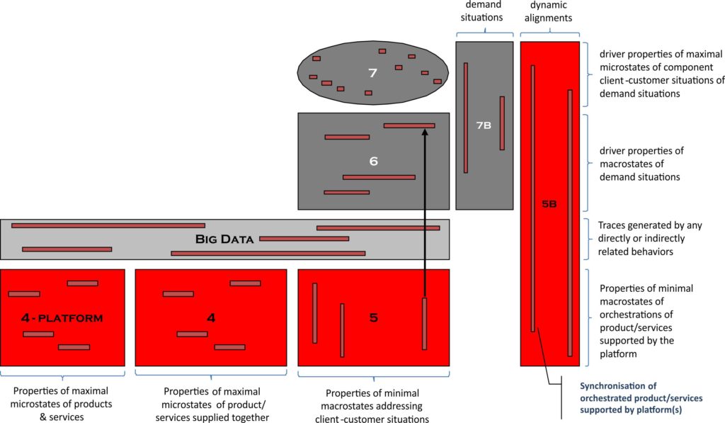 Note the ‘big data’ matrix here, representing all possible traces of behavior, whether generated directly or indirectly, which support the K-type dynamic alignment processes, along with the platform (matrix 4-platform), through which multiple product/services are dynamically aligned to the customer situations in matrices 6 and 7.[2] Whereas the effects ladders (matrix 6) define how effects are generated on the overall demand situations of client-customers (matrix 7B), Matrices 5 & 5B define the K-type propositions through which ‘big data’, the platform and the product/services are orchestrated and aligned to the customer situations.