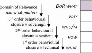 The third-order source of constraint on this second-order non-deterministic behavioral closure of the sentient system is then the external regulatory management hierarchy constraining the social components of the socio-technical system. In cybernetic terms, this 3rd order governance system exercises sovereignty through the way management-supervision processes are authorised to align the behaviors of the constituent workgroup tasks of an organisation to an overall strategic objective. The way in which these behavioral closures stratify the relations between the WHAT, HOW, WHO/M and WHY is shown in Figure 1.Figure 1: The orders of behavioral closure