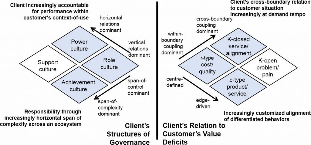 The names of the quadrants in the LHS diamond distinguish what it feels like to be working in each quadrant: the alienation of a role culture, the potential for burnout in an achievement culture, the necessary alignment to task leadership in the power culture and the enabling nature of a support culture (Harrison 1987). Each one of these quadrants reflects a different way of balancing the vertical and horizontal axes of accountability. The two diamonds are mirror images of each other, albeit each with its own dynamics. Examining the congruence of positionings on the LHS and the RHS provides a way of examining the alignment between the (LHS) internalist consistency of governance and the (RHS) externalist consistency of the positioning of a symbiont’s value propositions within the structural ecosystems in which it is competing.