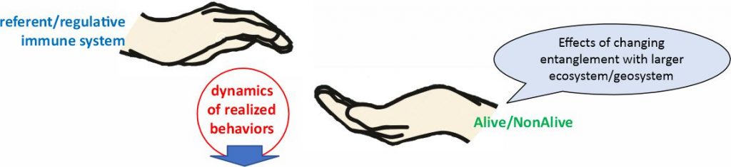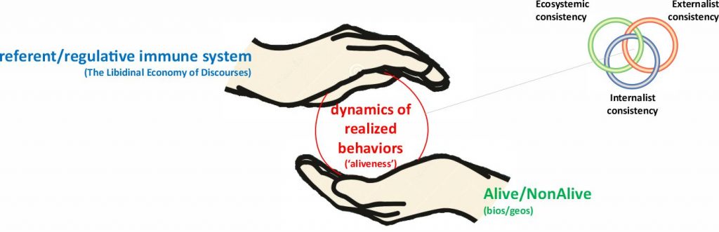 Changes in the environment of a structural ecosystem create new selective pressures. Whether or not the doubling of the double task, introduced in the 1st blog, needs to become a general property of a holobiont depends ultimately on whether it has to be able to compete in turbulent environments. These selective pressures require that a holobiont’s governance must be holding in mind all three of its consistencies as a living system, introduced in the 4th blog. Figure 1 provides a visual metaphor for the way the realized behaviors of a holobiont are subject to selective pressures from the environments in which it operates (lower hand) while also supporting the ‘truths’ with which the members of its cultural immune system (upper hand) are identified: