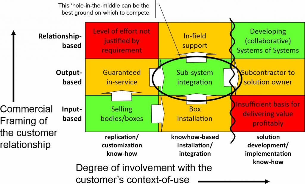 The r-type and c-type contracts on the left in the figure above are easily delivered by hierarchies. The K-open contracts on the right of the figure require an intimate relationship with the customer’s context-of-use. The middle column, corresponding to K-closed primary tasks, falls somewhere in between, forming a hole-in-the-middle insofar as a corporation relies on Faustian mechanisms to interpret its K-open context.